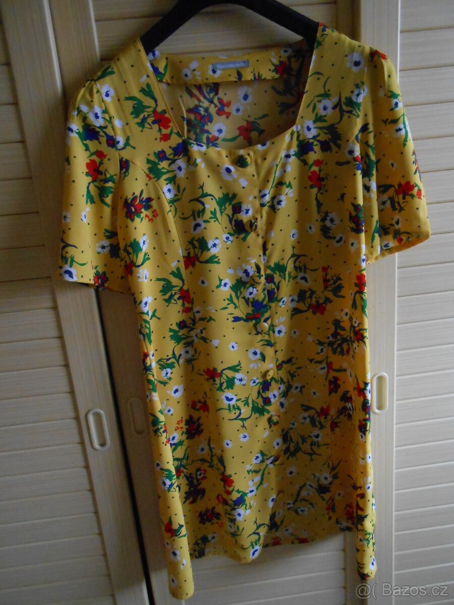 Žluté letní šaty, falešná léga, nejsou rozepínací, délka 95 cm, přes prsa 106/108