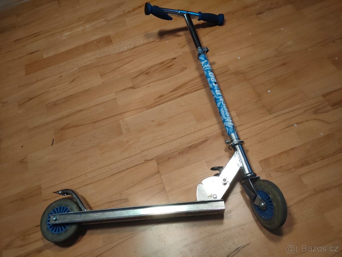 Prodám dětskou koloběžku s pevnou kovovou konstrukcí v modro-stříbrném provedení. Koloběžka je plně funkční, kolečka jezdí bez problémů. Má běžné známky používání odpovídající stáří. Pravé pěnové madlo už odpadá, viz obrázek. Osobní předání, v případě zájmu mě kontaktujte přes SMS.