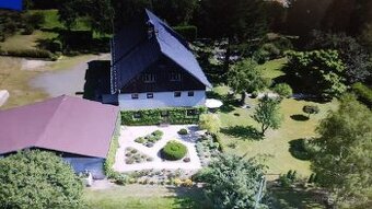Cena: V textu. Nabízím k prodeji nebo výměně stylovou rekreační chalupu 220 m2 s pěknou udržovanou zahradou. Pozemkem o výměře 2422 m2 je zanesen v územním plánu. Částečně podsklepený dům postavený r.1910 byl postupně zrekonstruován. Nová plastová okna, etážové topení ,kombinovaný kotel na uhlí, dřevo nebo pelety, podlahy, elektrický bojler. Vlastní studna 16m po rekonstrukci, septik se vsakováním také po rekonstrukci. V přízemí domu najdete verandu jako zádveří, kotelnu, halu s krbem a posezením, ,prostornou koupelnu s vanou, sprchovým koutem, toaletou a finskou saunou. Kuchyně s jídelnou a stylovou vyhřívanou pecí, pokoj využívaný jako pracovna, šatna, technická místnost a dveře do garáže s dílnou a místem na jedno stání. V prvním patře domu se nachází velký obývací pokoj, pokoj pro hosty, velká ložnice s vestavěnými skříněmi a velkou šatnou, naproti ložnici se nachází pokoj vhodný k vybudování druhé koupelny - momentálně využívaný jako pracovna, další pokoj je využíván jako tělocvična. Ve druhém