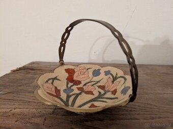 Ručně malovaný košík / miska s kovovým uchem – mosaz