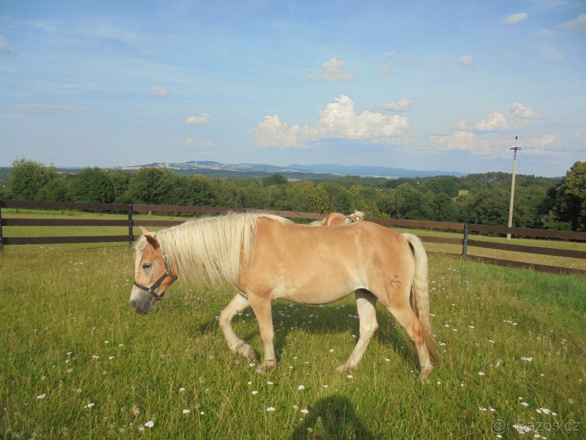 Stáj s chovem Haflingů prodá 3letou klisnu s PP,0% cizí krve po Stahlmman Obrok z Marliana po Stiglmar.Klisna je hodná,vychovaná,zvyklá na malé děti,nekope,nekouše,zvyklá na vet,.,kováře,resp.el.ohradník,je zvyklá přes den venku na noc v boxe ale není podmínkou.Byla by dobrá do spřežení,do pony sportu,chovu,pro rekreaci či jako rodinný koník,klisna má pěknou dlouhou hřívu na obě strany.Zvyklá na motorky,traktor,auta.Sourozenci úspěšný ve sportu i na výstavách.Před.KVH mezi 142-145cm.Má krásné prostorné chody.Cena 120tis.,