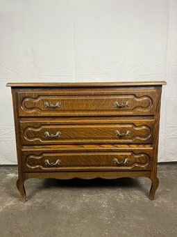 Šířka 91 cm, hloubka 47 cm, výška 75 cm. Krásná menší komoda z masivního dřeva s přirozenou kresbou a teplou patinou. Čisté proporce doplňují profilované čela zásuvek, jemně tvarované nohy a dekorativní kovové úchyty, které podtrhují její klidný, nadčasový charakter. Osobní odběr a doprava: Preferujeme osobní vyzvednutí. Nabízíme rozvoz po celé ČR i do zahraničí 12 Kč/km (počítá se celá trasa, tam i zpět). Při zájmu více zákazníků v jednom směru je možné využít sdílenou dopravu. Je možné se domluvit také na zaslání přes TOPTRANS nebo Českou poštu, ale upozorňujeme, že doručení může trvat i 14 dní. Podmínky prodeje: Jedná se o starožitné/použité zboží, které může nést známky opotřebení. Stav odpovídá fotografiím. Osobní prohlídka možná po domluvě. Vrácení není možné, nabízíme však výměnu za jiný kus stejné nebo vyšší hodnoty (s případným doplatkem). Doklad o koupi na vyžádání (vše evidujeme pro DP).