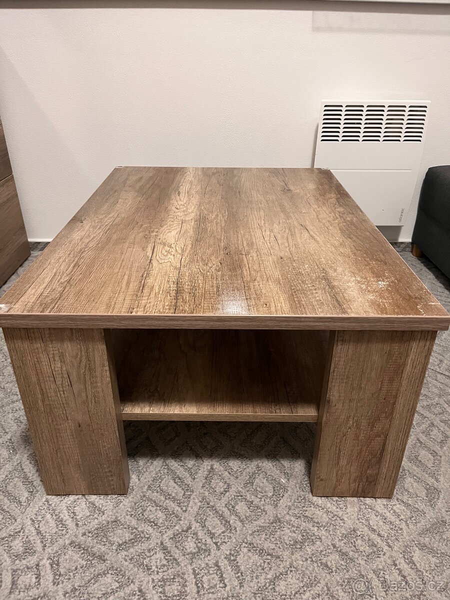 Prodám tento konferenční stolek. Je to silná dřevotříska, takže stůl je pevný a stabilní. Nicméně na rozích byly chrániče, které rohy poškodily viz foto. Jedna strana horní desky je opotřebená, také viz foto. Chtěla jsem na něj nechat vyrobit tmavé sklo, aby se poškození zakrylo, protože jinak je vše v pořádku, nicméně jsem zvážila koupi menšího stolku, kvůli místu v malém obýváku. Třeba najde svůj nový domov :) Rychlé jednání, sleva jistá! (Vyzvednutí obec Dětkovice)