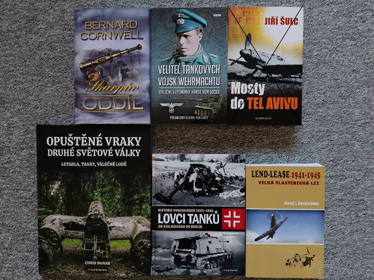 Cena: V textu. Prodám knihy, nové, nečtené: Sharpův oddíl - Bernard Cornwell - 170 Kč Velitel tankových vojsk wehrmachtu - Hans Von Luck - 250 Kč Mosty do Tel Avivu - PRODÁNO Opuštěné vraky druhé světové války - Letadla, tanky, válečné lodě - CHris McNab - 390 Kč Lovci tanků 1943 - 1945 - Thomas Anderson - 390 Kč Lend - Lease 1941 - 1945 - Velká vlastenecká lež - Alexej I. Kondratěnko - 150 Kč Platba předem na účet, zašlu přes Zásilkovnu (89 Kč), Balíkovnu (95 Kč) nebo Českou poštou (dle rozměrů a váhy). Osobní odběr možný po předchozí domluvě výhradně u mě doma v Praze 15. Prosím pište, telefon je neplatný.