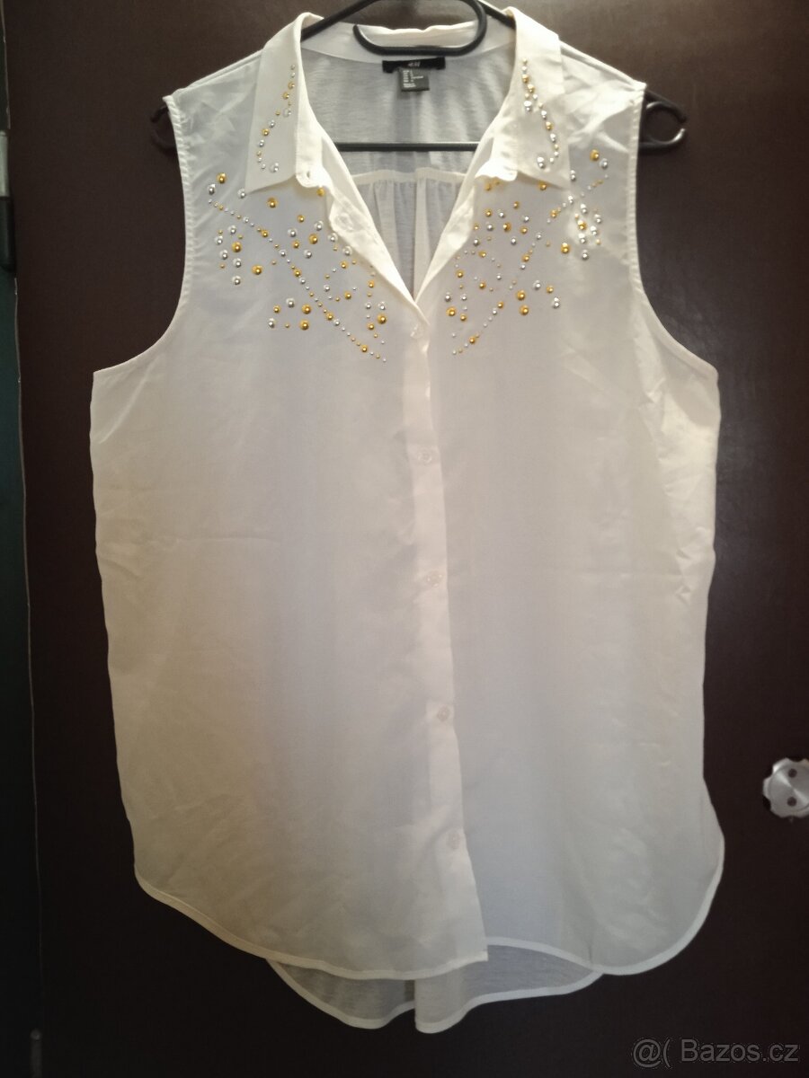 Prodám halenku H&M, 100% polyester. Velikost L, přední délka 66cm, zadní 80cm, obvod přes prsa, v pase i bocích 120cm.