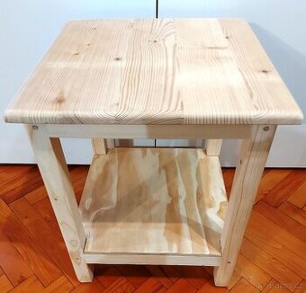 Prodám stoličku (štokrle) z masivního dřeva. Kostra stoličky je vyrobena ze smrkových hranolků 4cmx4cm. Horní sedací plocha je ze smrkových desek. Horní sedací plocha má rozměr 43cm x 43cm a tloušťku 18mm a je ke stoličce přilepena na kolících. Rozměry stoličky jsou 40cm x 40cm, výška 53cm. Ve výšce 10cm od země jsou trnože ze smrkových hranolků, na kterých je umístěna polička z dýhované překližky tloušťky 12mm. Celá stolička je jemně obroušena a není natřena (možnost natření, namoření nebo napuštění dle vlastní představy. Hmotnost stoličky cca 6,5kg. Stoličku můžu poslat kurýrní službou za 110Kč.
