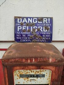 Další parádní kousek z USA smaltovaná cedule pozor vysoké napětí evidentně dostala pár zásahu pistolí a tak má zajímavou patinu rozměry 30x46 období cca 50. léta Sleduj nás i na IG:staragaraz industriální stará garáž semafor usa dekorace Plechovka od oleje Benzínový stojan Coca Cola Pepsi Retro Garáž USA Americký Veterán Youngtimer Mancave Cedule Automat Lednice Shell Mobiloil Michelin Neon