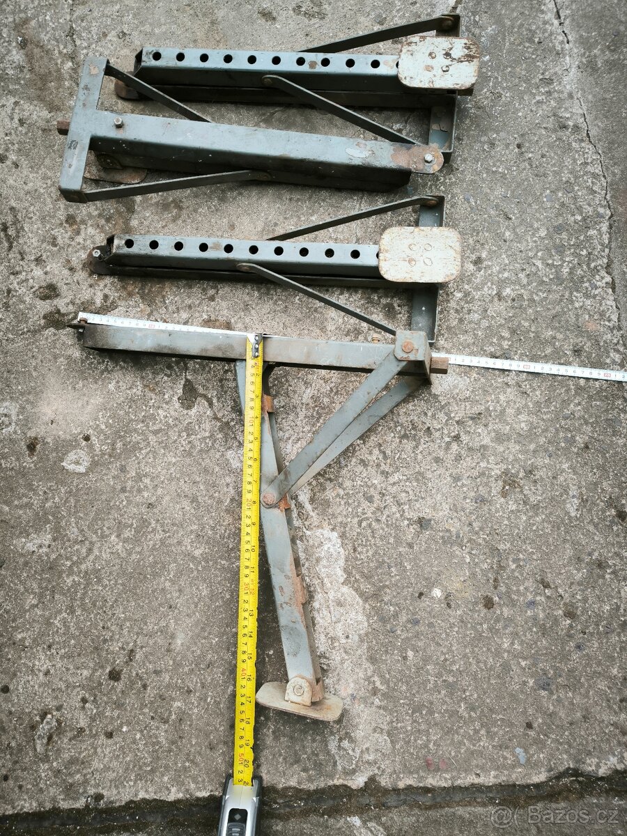Cena: Dohodou. Prodám 4 kusy podpěrných nohou k vozíku. Domácí výroba. Krátce použité, nepoškozené. Šroub s lichoběžníkovým závitem ocelový, matice je mosazná. Rozměry jsou na foto. Pouze osobní odběr