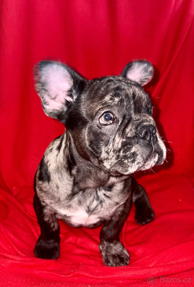 Francouzský buldoček bez průkazu původu.Pejsek Merle barvy,má kompletní očkování , čip,několikrát odčervený.Další informace o po tel.722 694 263.Platí do smazání.
