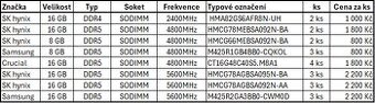 Prodám paměti (RAM) do notebooků (SODIMM) DDR4 a DDR5. Různé velikosti i různé rychlosti. Vše je v tabulce včetně ceny za 1ks.