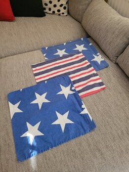 Prodám tři povlaky na polštáře, 35x35 cm. Používané, v dobrém stavu, pouze bledější barva. Barevné, laděné do barev a vzorů americké vlajky, zapínání na knoflíky, hladké. Materiál: 100% bavlna. Rozměry: délka 35 cm, šířka 35 cm. Uvedená cena je za všechny tři kusy dohromady.