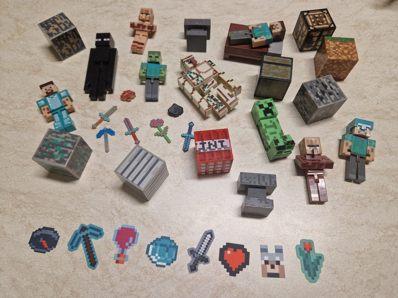 Sada plastových kostek a 9 figurek z Minecraftu, vše co je na fotce + nažehlovačky. Figurky mají pohyblivé ruce a nohy, nekteré části lze odepnout. Zásilkovna nebo Balíkovna dle aktuálního ceníku. Kontakt prosím e-mailem.