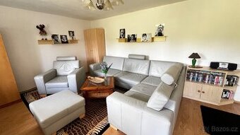 Rozkládací kožená sedačka s úložným prostorem, kožené křeslo s úložným prostorem a kožený taburet s úložným prostorem. Rozměry sedačky 3100x2200x900, vady viz foto. Po domluvě možnost i odvozu , případná dohoda o ceně možná.