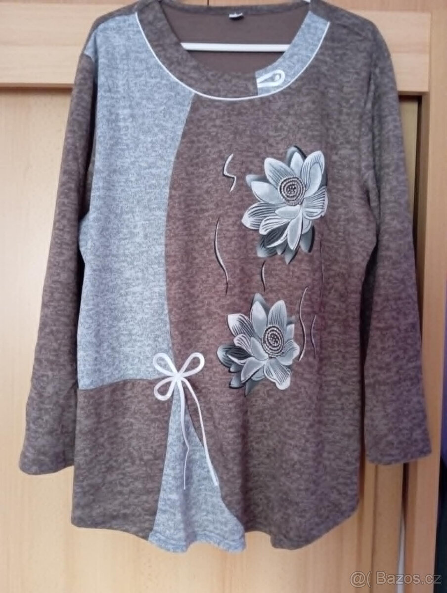 prodám novou halenku velik.4XL,hnědo šedá,uvnitř kytiček lesk,mater. 65% bavlna,35% polyester.Cena je slevněná.