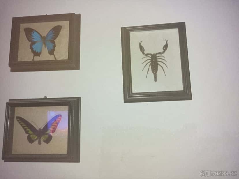 Prodám obrazy štír, modrý motyl,Motýl zasklený "Troides Brookiana" , Borneo