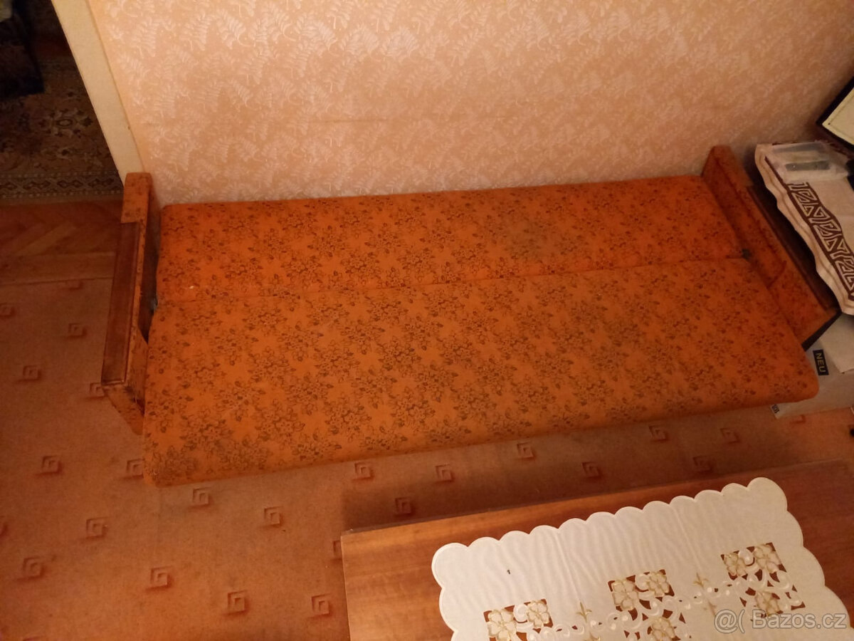z 50. let. Zachovalý stav. Rozměry: gauč - délka 200cm,výška 70 cm, hloubka 75 cm - sklopené opěradlo na 90 cm. Cena dohodou.