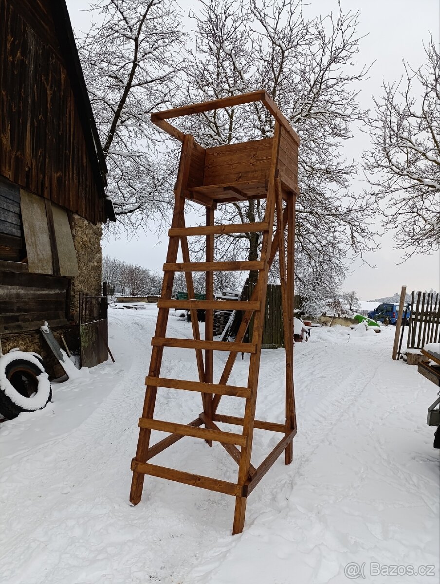 Prodám myslivecký žebřík, výška sedla cca 3m a 1m šířka, materiál smrk ohoblovaný, 2x nátěr olejovou lazurou Remmers, stojny 5x10cm, ostatní 3,5x8cm, boky 19mm palubky, sedadlo a opěrka 3cm síla. Cena je uvedena za tento 3m vysoký. Možnost výroby jiné velikosti, možnost střechy - střecha je zalaminovaná + 1500,-.