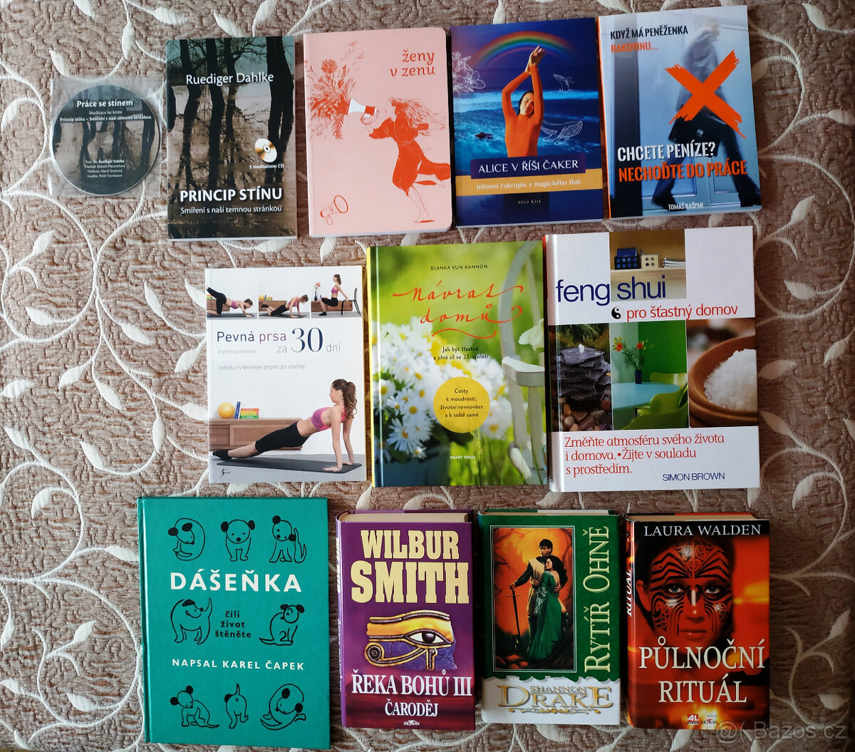 Cena: V textu. Redukuji knihovnu a nabízím na prodej nové nebo jednou čtené knihy v super stavu: 1) Ruediger Dahlke: Princip stínu + CD s meditacemi ke knize - nová nečtená, cena 35O Kč. 2) Lilia Khoustnoutdinova, Petra Schwarz Koutská: Ženy v zenu - nová nečtená, cena 100 Kč. 3) Alice Kirš: Alice v říši čaker - nová nečtená, cena 100 Kč. 4) Tomáš Kašpar: Chcete peníze? Nechoďte do práce! - kniha je s podpisem autora, nová nečtená, cena 290 Kč. 5) Brigitte Engammare: Pevná prsa za 30 dní - nová nečtená, cena 100 Kč. 6) Blanka vun Kannon: Návrat domů - Jak být šťastná a plná sil ve 21. století - nová nečtená, cena 290 Kč. 7) Simon Brown: Feng Shui pro šťastný domov - nová nečtená, cena 100 Kč. 8) Laura Walden: Půlnoční rituál - jednou čtená super stav, cena 120 Kč. 9) Shannon Drake: Rytíř ohně - jednou čtená, super stav, cena 100 Kč. 10) Wilbur Smith: Řeka bohu III Čaroděj - nová nečtená, cena 120 Kč 11) Karel Čapek: Dášeňka, čili život štěněte - pěkný stav, cena 100 Kč. Bližší info na mailu.Podívej