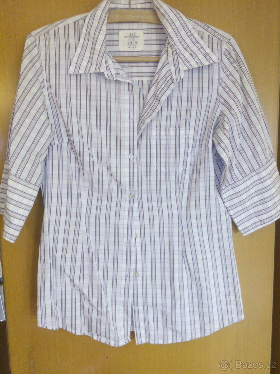 Dámská košile s tříčtvrťovým rukávem a manžetou,projmutý střih,tmavě fialový proužek,při jiném osvětlení působí spíš jako hnědý,vel.40,délka 72 cm