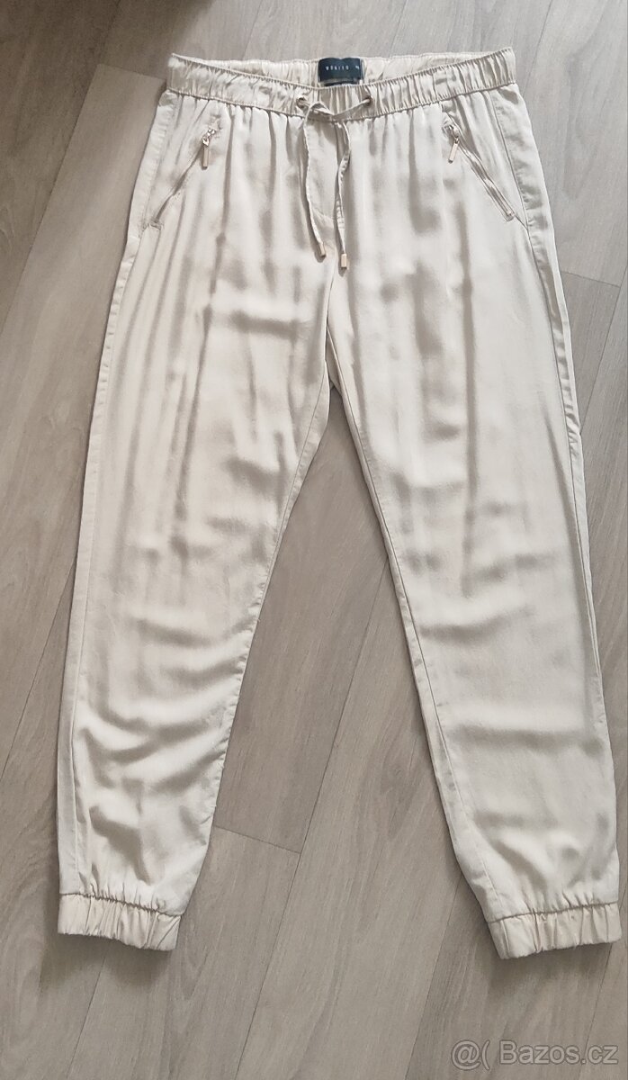 Příjemný materiál,v pase šňůrka,kapsy na zip,na konci nohavic gumičky. Délka 98cm,pas 42cm,boky 56cm. Značka Mohito velikost 40
