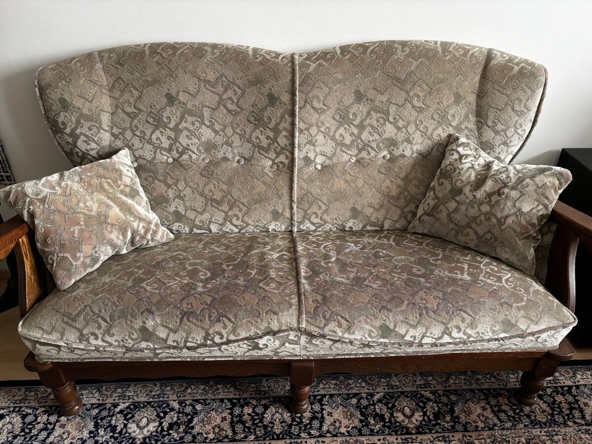 Nabízím k prodeji sedačku a 2 křesla s masivním dřevem. Rozměry-sedačka: délka: 175, délka madla: 63 cm, hloubka sedáku: 53cm, výška opěrky: 70 cm. Křeslo - šířka: 72 cm, výška od země: 100 cm. Komplet máme 7 let v bytě, který slouží pouze k občasnému přespání. Nese známky běžného používání. Sedačka je profesionálně vyčištěná.Důvod prodeje - změna interiérového designu. Osobní odběr Praha 10- Bohdalec.V případě zájmu kontakt tel.606900607 - Dominik Sokol.