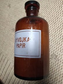 Skleněná lahev na vývojku, 1 litr. Zabroušené hrdlo. Nepoškozená. Plzeň. Tel. 777836177