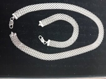 Prodám-Starožitný široky stříbrný set. Punc 925/1000,šířka 1cm,délka náramku 20,5cm.Řetízek šířka 1cm,délka 46cm.Celková váha 44.60g.Možnost poslat poštou nebo zásilkova, osobní předání.