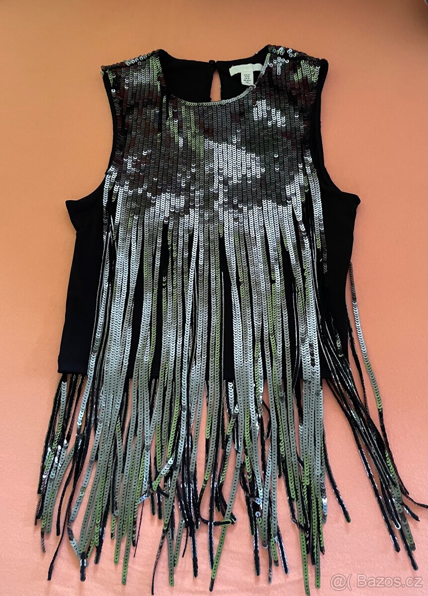 Prodám téměř nenošený černý top H&M s pajetkami i na třásních (viz foto). Velikost Eu XS. Top je pružný, zapíná se na knoflíček za krkem. Osobní převzetí Praha 6 Dejvice. Po předchozí dohodě a úhradě mohu zaslat. Poštovné by bylo dle aktuálního ceníku přepravní společnosti.