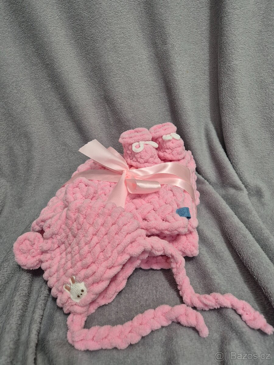 Prodám set pro holčičku, upleteno z příze alize puffy. Měkkoučká deka, čepička a papučky mohou být originálním dárečkem pro narozené miminko. Velikost deky je 60x90 cm, obvod čepičky 41 cm. Osobní předání Ostrava, nebo přes zásilkovnu