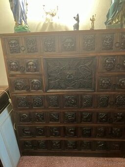 Cena: Nabídněte. Jedná se o bohatě vyřezávanou dřevěnou skříň se zásuvkami a dvířky, pravděpodobně ve stylu renesance nebo tudorovské obnovy. Rozmery: 121 x h 32 x 138