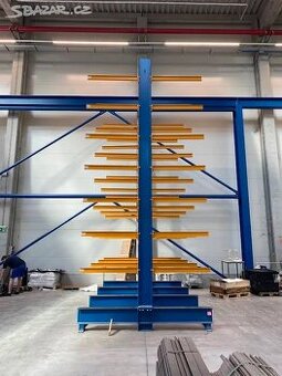 Cena: Dohodou. Oboustranný konzolový regál, 4 sloupy, výška 6500 mm, délka 4500 mm,výborný stav, rok výroby 2022. - 4 ks stojek IPE 240 - osová vzdálenost stojek 1500 mm - výška stojky: 6510 mm - max. výška uložení: 6000 mm - počet trnů na sloupu: 7 ks - délka trnu: 1300 mm, IPE 80 - nosnost trnu při rovnoměrném zatížení v průběhu celé délky trnu: 340 kg – guma na dosedacích plochách Na fotu 1 regál, k dispozici celkem 4 regály. Daňový doklad samozřejmostí. Regály jsou demontované.