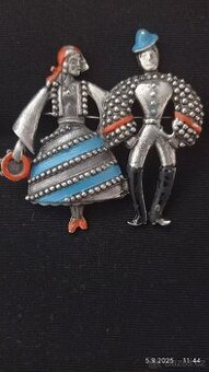 Vintažni brož, pár v kroji. Kovová smalt místy chybí. Zapínání funguta však tam chybí čudlík, jehla je silná ale ohnutá Věc je stará a použitá, nese známky opotřebení Platba předem na účet. Odesílám: PPL, Balikovna. Pozor ne odesílám Zásilkovna! Na dobírku neposílám! Pouze při platbě zálohy. V tomto případě cena bude výši.