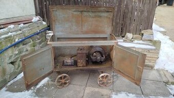 Prodám starý stabilní elektromotor pro pohon hospodářské techniky. Starožitný stabilák, pohon strojů pomocí koženého klínového řemene. Velký třífázový motor značky Svet, Brno Židenice. Plechová skříň, dvířka, odklápěcí stříška na pantech, litinové kola. V zachovalém, nálezovém stavu s patinou. Nevyzkoušené, prodávám jako nefunkční dekoraci. Rozměry a stav viz fotografie.