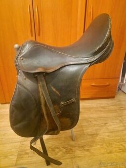Prodám starší anglické sedlo včetně třmenových řemenů. Míry na fotu.