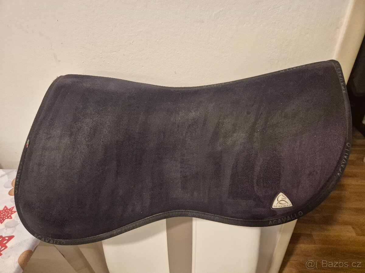 Dokonalá tlumící dečka Acavallo, vysoká paměťová pěna. Perfektní pro kone v rekonvalescenci, s atrofovanými zádovými svaly, či z jakéhokoliv důvodu nepadnoucím sedlem. Výborně tlumí nárazy do zad koně a rozkládá rovnoměrně váhu sedla. Řeší problém s klouzajícím sedlem díky protiskluzové úpravě semišového obalu. Sedí pod anglická sedla, možné použít s i bez klasické podsedlové dečky. Barva černá, je bez vady. Při rychlém jednání zásilkovna/balíkovna v ceně. PC 3000,-Kč