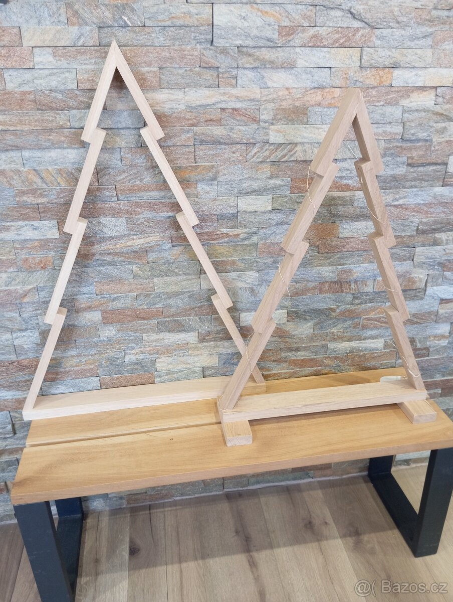 Prodám dva stromečky z dubu tl. 20mm. Bez nátěru. Zdarma udělám nátěr olej nebo transparentní lazura s impregnací. Velikost 60 a 80cm. Základna cca 50cm. Cena malý 1000kc Velký 1200kc.