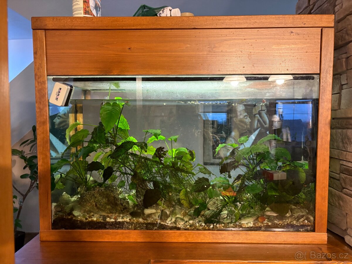 Prodám akvárium o objemu 125 litrů s dřevěným rámem. Horní část je otevírací na systém tip-on (bez madla, otevírání na zatlačení), takže působí čistě. Součástí prodeje je kompletní vybavení: filtr, zeleň a dekorace, osvětlení (zářivka), rybičky (cca 6 ks neonek + 4 ks dalších rybek. Zkrátka vše, co je vidět v akvárku na fotkách. Akvárium je funkční, stačí převézt, vyčistit a znovu zprovoznit. Cena: 3000,- Pouze osobní odběr v Českých Budějovicích. V případě zájmu mě kontaktujte.