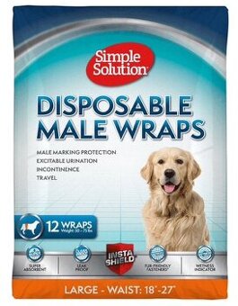 Prodám levně 12 balení jednorázových plen pro psy (samce). zn. Simple Solution velikost L, pro psy od 23 - 34 kg, obvod slabin 45 - 69 cm. Pleny jsou spolehlivé proti inkontinenci, mají široké upínací pásky umožňující jednoduché a rychlé nasazení a indikátor vlhkosti. Pleny jsou originálně zabalené. K dispozici 12 balení (1 balení obsahuje 12 ks)cena za balení 160,-- Kč (v obchodě 265,-- Kč)