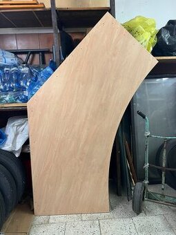 Prodám stůl nepravidelného tvaru tvaru , šíře 70, 80 cm viz. obrázek, deska lamino tl desky 2,5cm světlý zachovalý - tvořil prodejní pultík podpory - 2ks ocelové stojiny a 3ks ocelových nohou