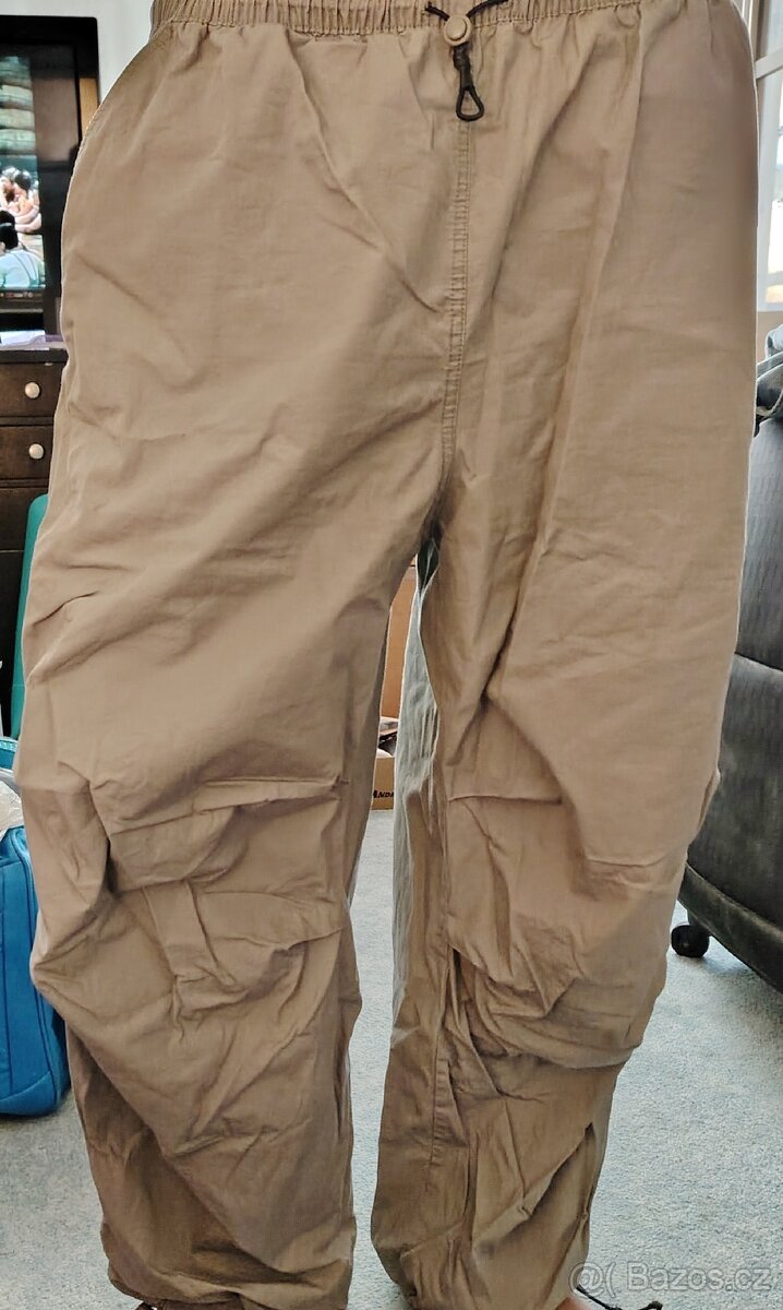Prodám, lehké plátěné kalhoty, málo nošené. Dole nohavice na gumu. V předu kapsy. Barva světle khaki , vel.L. V pase guma 46-52 cm. Délka 100cm.