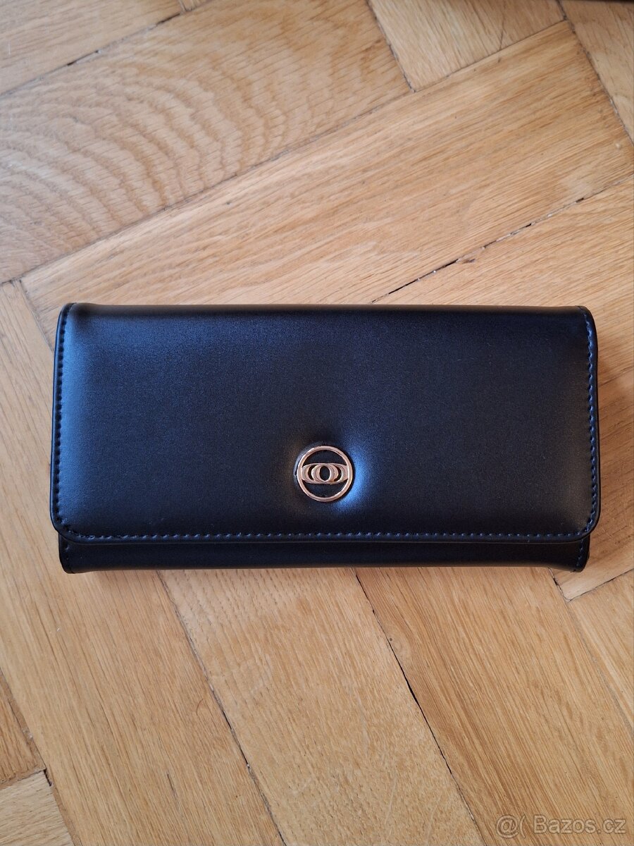 Černá koženková peněženka v dárkovém balení. Zakoupeno v Orsay. Nová 19,5 cm x 10 cm Uvnitř přihrádka na bankovky, na zip na drobné a přihrádky na kreditní karty.