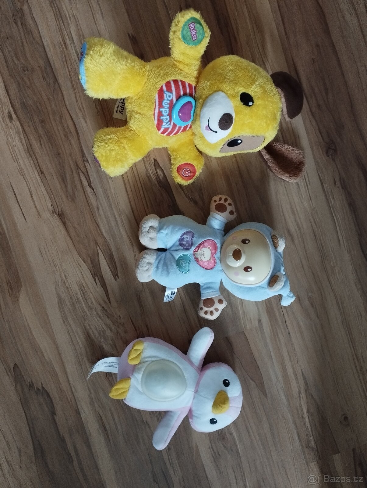 Hajánek méďa - Stlačením látkových tlačítek uslyší dítě různé roztomilé věty, hudební zvuky nebo zvuky přírody. Usínáček tučňák- hraje příjemné melodie, bříško svítí a mění barvy Naučnÿ pejsek nabízí dítěti zábavnou společnost, kdy formou hry může dítko poslouchat zvuky, písničky, melodie a fráze. Také je seznámí s počítáním, rozpoznáváním částí těla a barvami. Vše funkční, téměř nehrané. Cena 250,-/ks. Osobní převzetí v Otmarově.