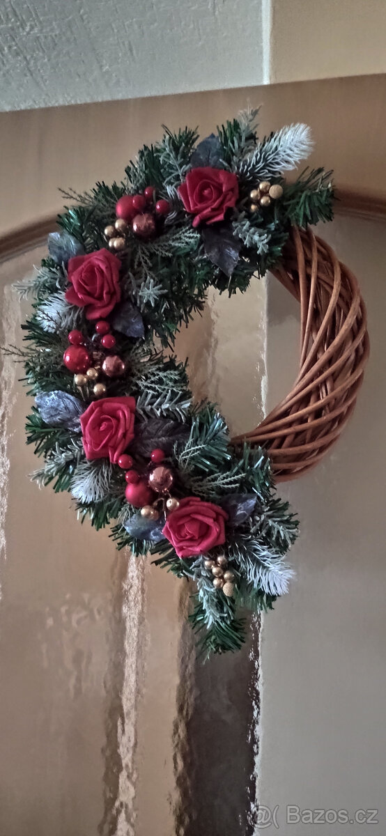 Trvanlivý věnec na proutěném základu o průměru 40 cm, doplněný umělým chvojím, růžemi, přízdobami. Cena 550 Kč + 90 Kč zásilkovna. Platba na účet.