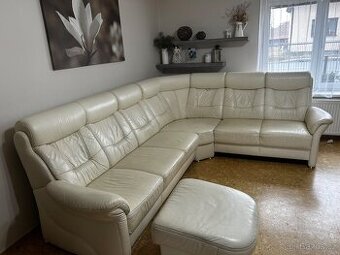 Prodám koženou sedací soupravu.Velmi pohodlnou a zachovalou. K Sedací soupravě je taburetka na nohy a potah na sedací soupravu v hnědě barvě
