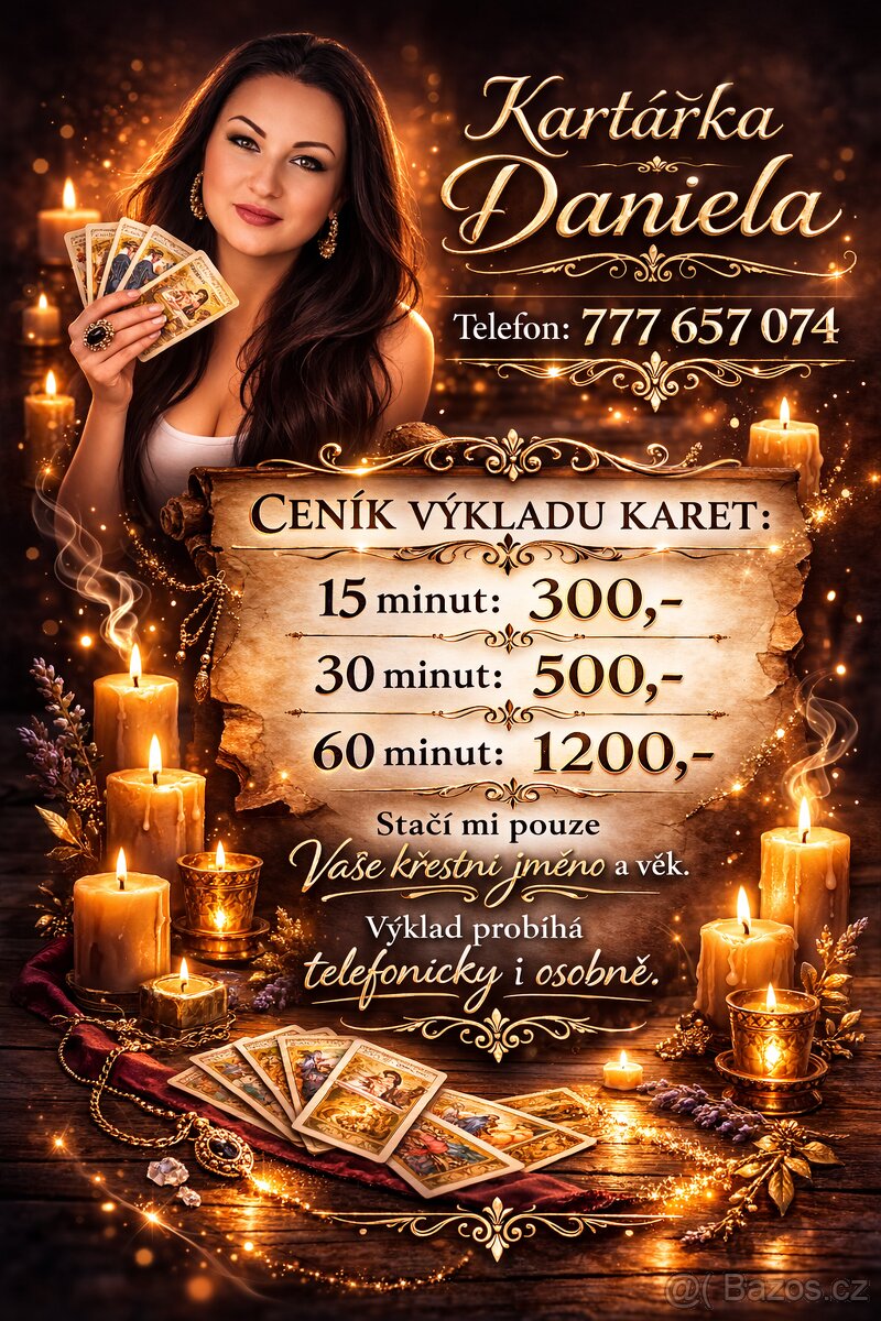 Karty nelžou... - výklad cikánských karet po telefonu i osobně - po připsání platby na účet, vždy denně od 17:00, telefonicky i osobně Nic o Vás vědět nepotřebuji! Ani datum narození! 15minut - 300,- 30minut - 500,- Velký výklad: 1.200,- Miluje mě? Dostanu tu práci? Jak se bude vyvíjet moje finanční situace? Proč se mi nedaří otěhotnět? Má jinou? Budeme se stěhovat? Budeme se spolu zase bavit? Myslí na mě? Mám odejít z práce? Zhubnu? Kam můj život směřuje?
