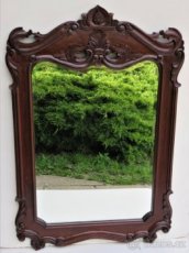 Prodám vyřezávaný mahagonový rám s fazetovým zrcadlem, Odstín palisandr, lak pololesk. Rozm: 110 x 80 cm Cena: 11.600,- Kč