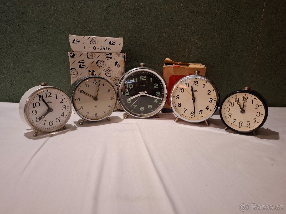 4 x Budík Prim 1x Splendex + 2x krabička Zleva: Bílý budík Prim - nejde Stříbrný budík Prim - funkční Bílý budím Splendex - nejde Červený budík Prim - rozeběhne se a po chvilce se zastaví Černý budík Prim - funkční Prodej komplet