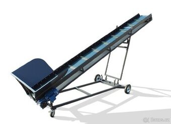 Pásový dopravník - 4 metry dlouhý, pás 35 centimetrů široký. Osazeno elektromotorem 380 V/50Hz, olejová převodovka. Dopravník má unášeče - lopatky. Odlehčená konstrukce pro lepší manipulaci s podvozkem a násypkou. Vhodný pro přepravu uhlí, štěpky, dřevěných špalíků, pelet, brambor, ovoce, suti, písku, pilin a sypkého materiálu. Doprava po celé ČR a SK za 800,-Kč. Uvedené ceny jsou bez DPH.