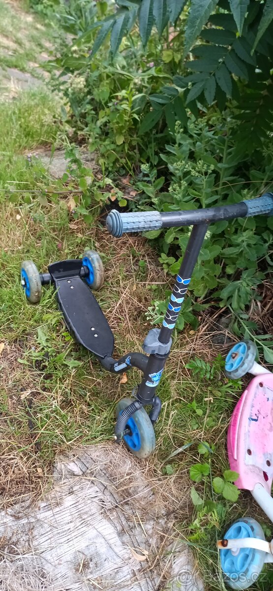 Prodám tyto starší koloběžky. Stav viz.fotky. Černá v dobrém stavu je za 50 Kč. Růžová má dírku v plastu, ale nemá vliv na funkci. Růžová je za 40 Kč. A poslední koloběžka zdarma ke kterékoliv z nich. Nebo samostatně třeba za nějaké ovoce pro děti. Koloběžky prodávají děti, aby měly něco do kasičky. Proto prodej za symbolické ceny.