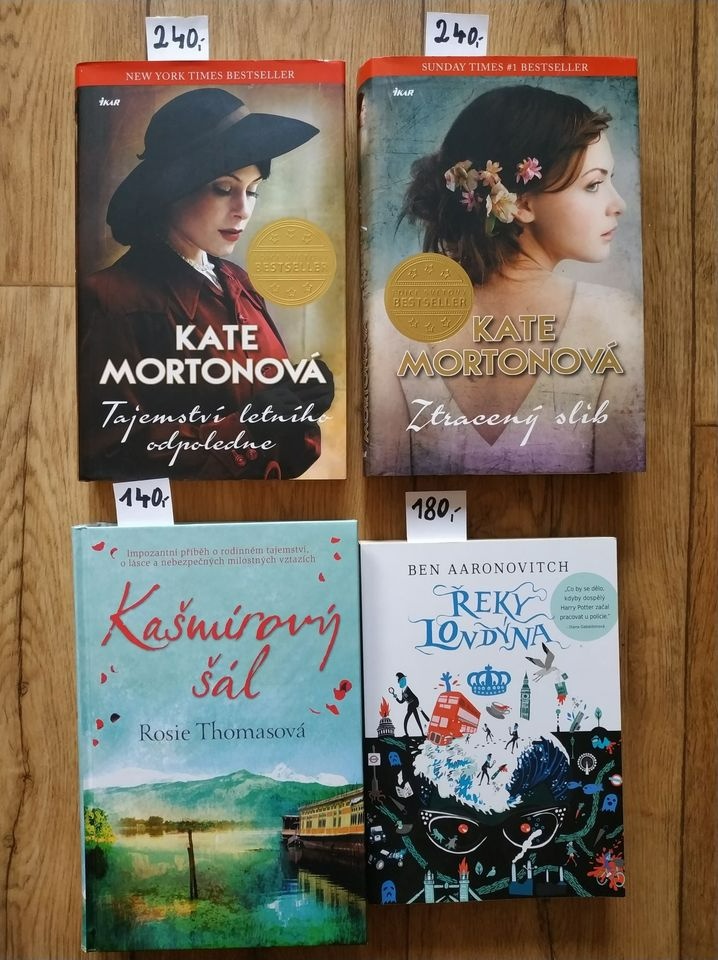 Cena: V textu. Kate MORTONOVÁ: Tajemství letního odpoledne – velice dobrý stav, jednou čtená: 240 Kč Kate MORTONOVÁ: Ztracený slib – velice dobrý stav, jednou čtená: 240 Kč Rosie THOMASOVÁ: Kašmírový šál – velmi dobrý stav: 140 Kč Ben AARONOVITCH: Řeky Londýna – velice dobrý stav, jednou čtená: 180 Kč Možnost osobního odběru: Kelč, Valašské Meziříčí, Vsetín nebo zaslat poštou, zásilkovnou (cena knihy + poštovné).